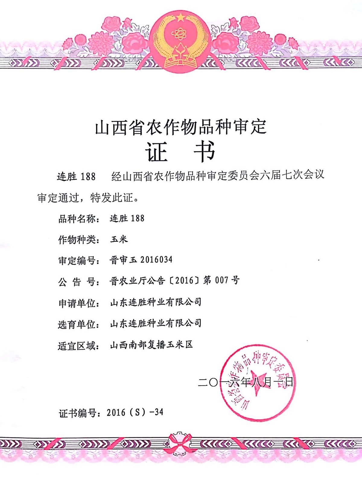 连胜188于2011年通过山东省农作物品种委员会审定,审定编号:鲁农审2011005号 ;2016年通过山西省审定,审定编号为:晋审玉2016034;2018年通过河北省、河南省同一生态区引种备案,引种号为:(冀)引种[2018]第2号6、(豫)引种[2018]玉061。
