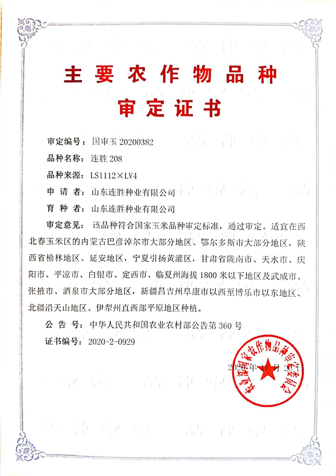 2015年通过山东省农作物品种委员会审定,审定编号为:鲁农审2015015;2020年通过西北区国审,审定编号为:国审玉20200382,是我公司继连胜2025之后又一国审品种。