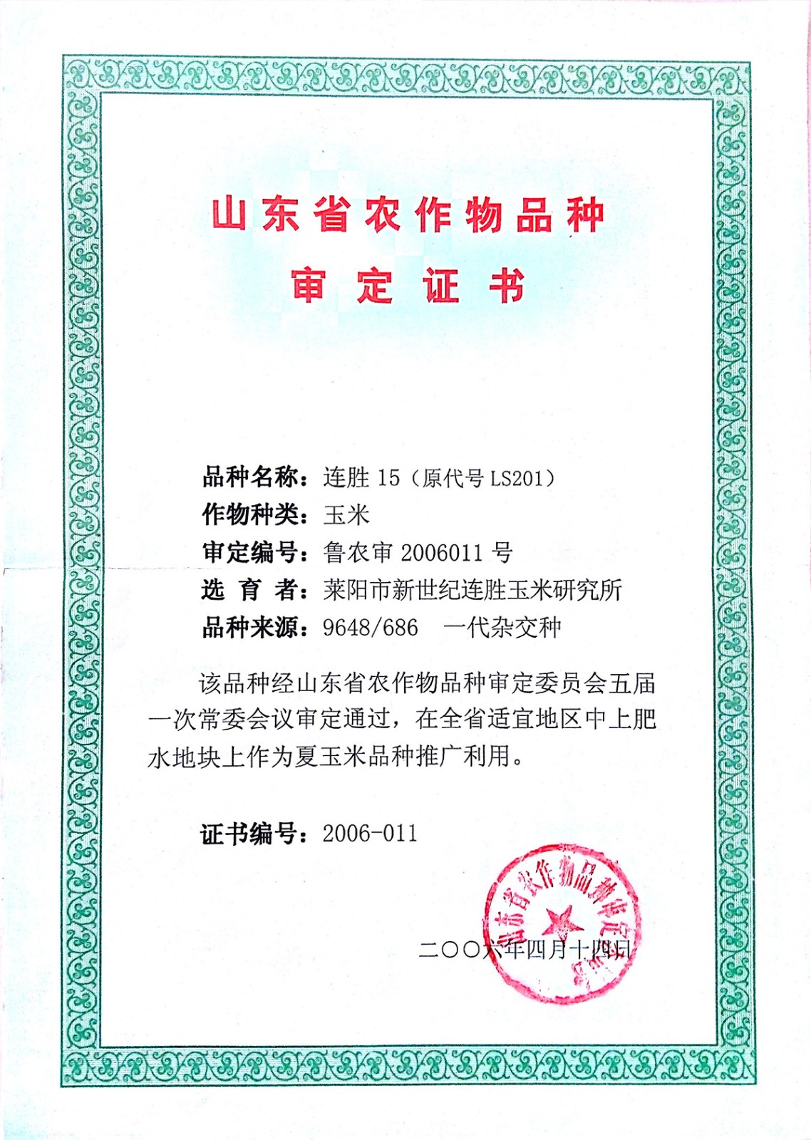 2006年通过山东省农作物品种委员会审定,审定号:鲁农审2006011号。2019年通过河北省同一适宜生态区引种备案,引种号为:(冀)引种[2019]第2号22,2022年通过河南省同一适宜生态区引种备案,引种号为:(豫)引种[2022]玉110。